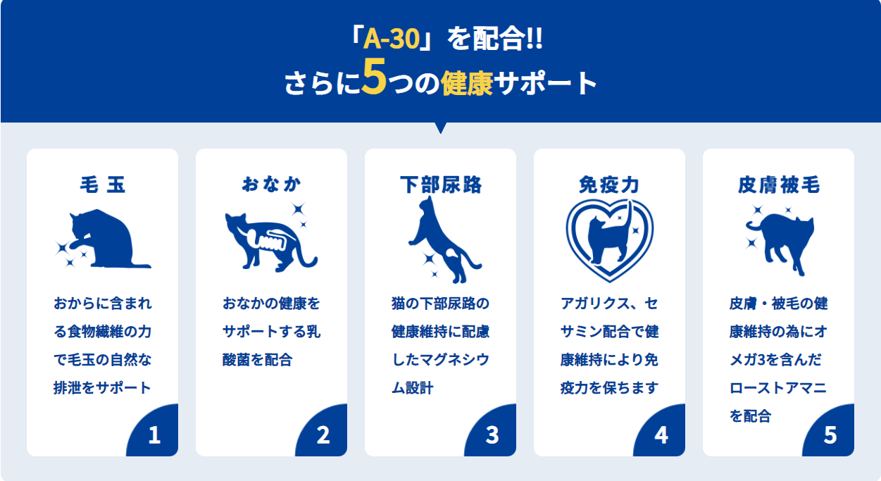 😺含有有助於AIM機能的氨基酸“A-30”是支持貓的健康維護的綜合營養食品。
