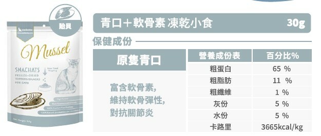 100%由原隻青口,是優質蛋白質的來源,可強健貓咪肌肉,還含大量軟骨素,能潤滑關節,促進關節健康;