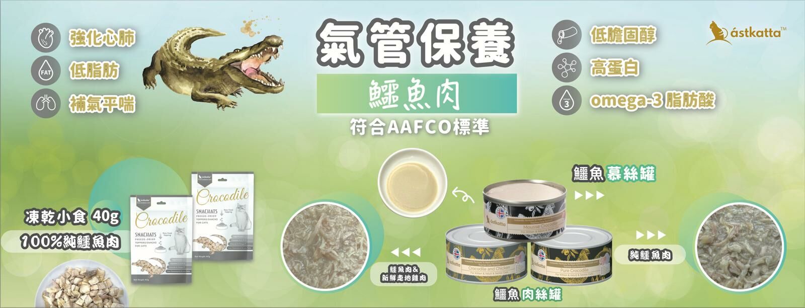 雞肉 38.54%、鱷魚肉 20%、營養湯 38.02%、葵花籽油、改性木薯澱粉、維他命及礦物質、牛磺酸、低聚果糖、絲蘭粉、蔓越莓萃取物、氧化鐵紅