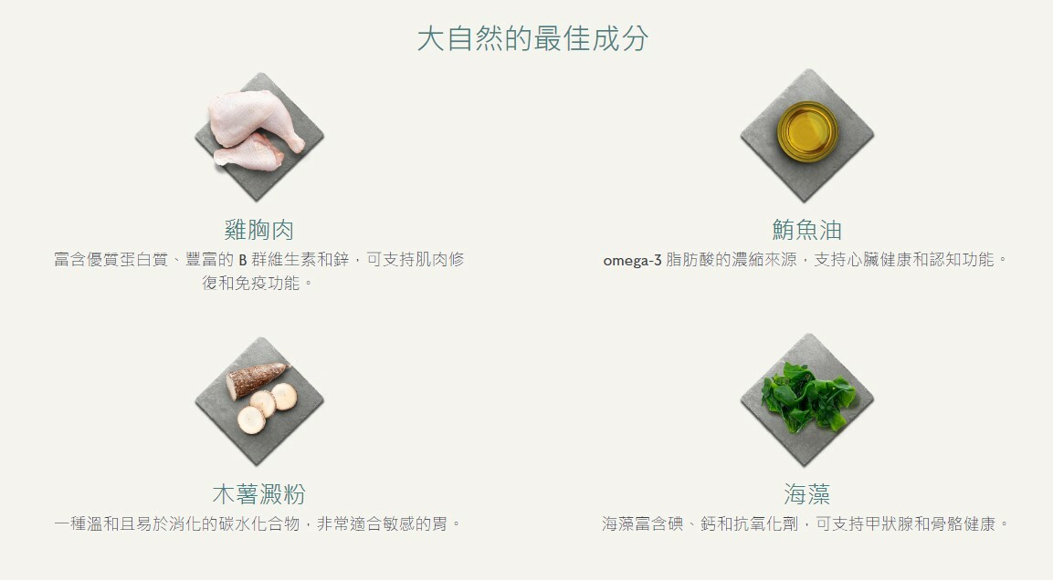 雞湯 89%、雞胸肉 5%、木薯澱粉、礦物質、海藻和吞拿魚油。