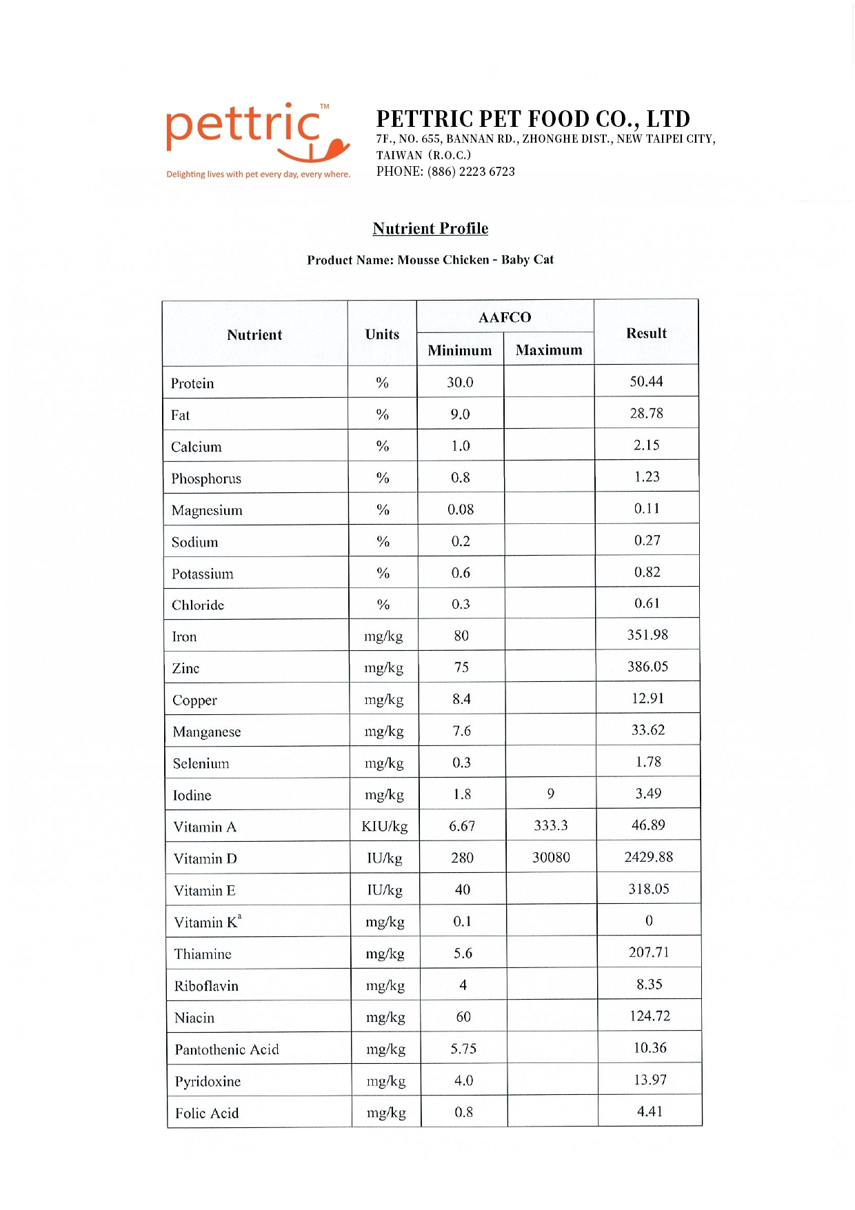 水、雞肉、大豆油、膠凝劑(修飾澱粉、鹿角菜膠、瓜爾膠、決明子膠、氯化鉀)、維生素與礦物質(磷酸鈣、一水硫酸亞鐵、維生素E、氧化鋅、硫酸錳、一水合物、維生素B3、維生素B1、氨基銅、亞硒酸鈉、維生素A、維生素B12、維生素D3、泛酸鈣、維生素B2、維生素B6、生物素、葉酸、硫酸氫鈉甲萘鯤、碘化鉀)、氯化膽鹼、牛磺酸