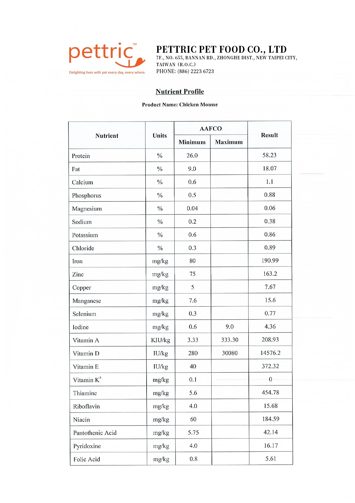 雞肉、雞肝、水、增稠劑、葵花籽油、天然風味、吞拿魚油、礦物質、低聚果寡糖、鹽、氯化膽鹼、牛磺酸、維他命