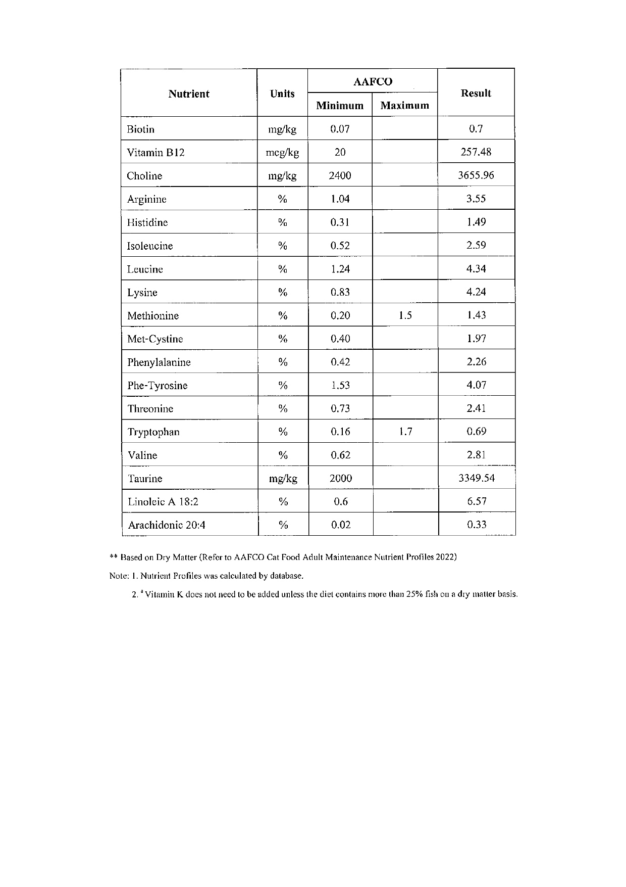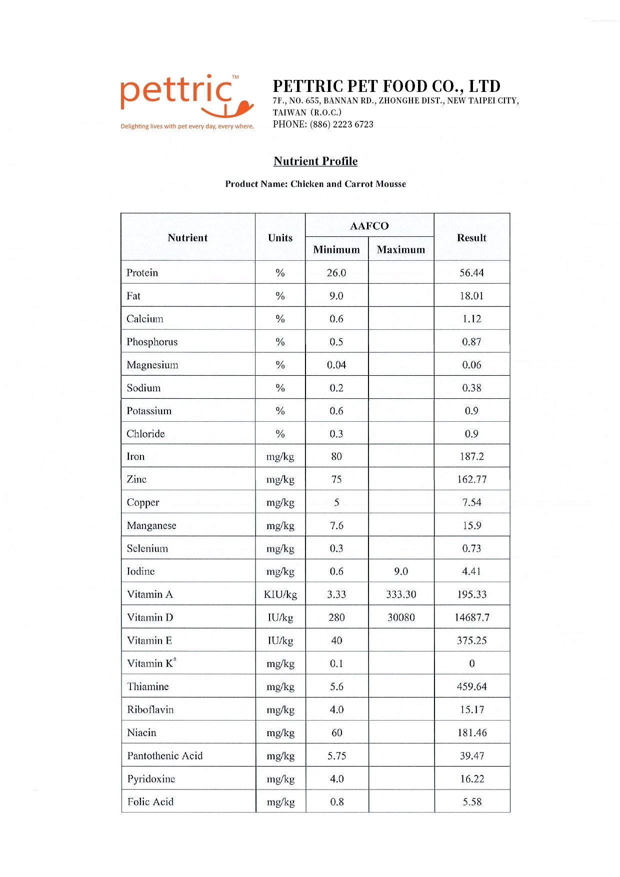 雞肉、雞肝、紅蘿蔔、水、增稠劑、葵花籽油、天然風味、吞拿魚油、礦物質、低聚果寡糖、鹽、氯化膽鹼、牛磺酸、維他命