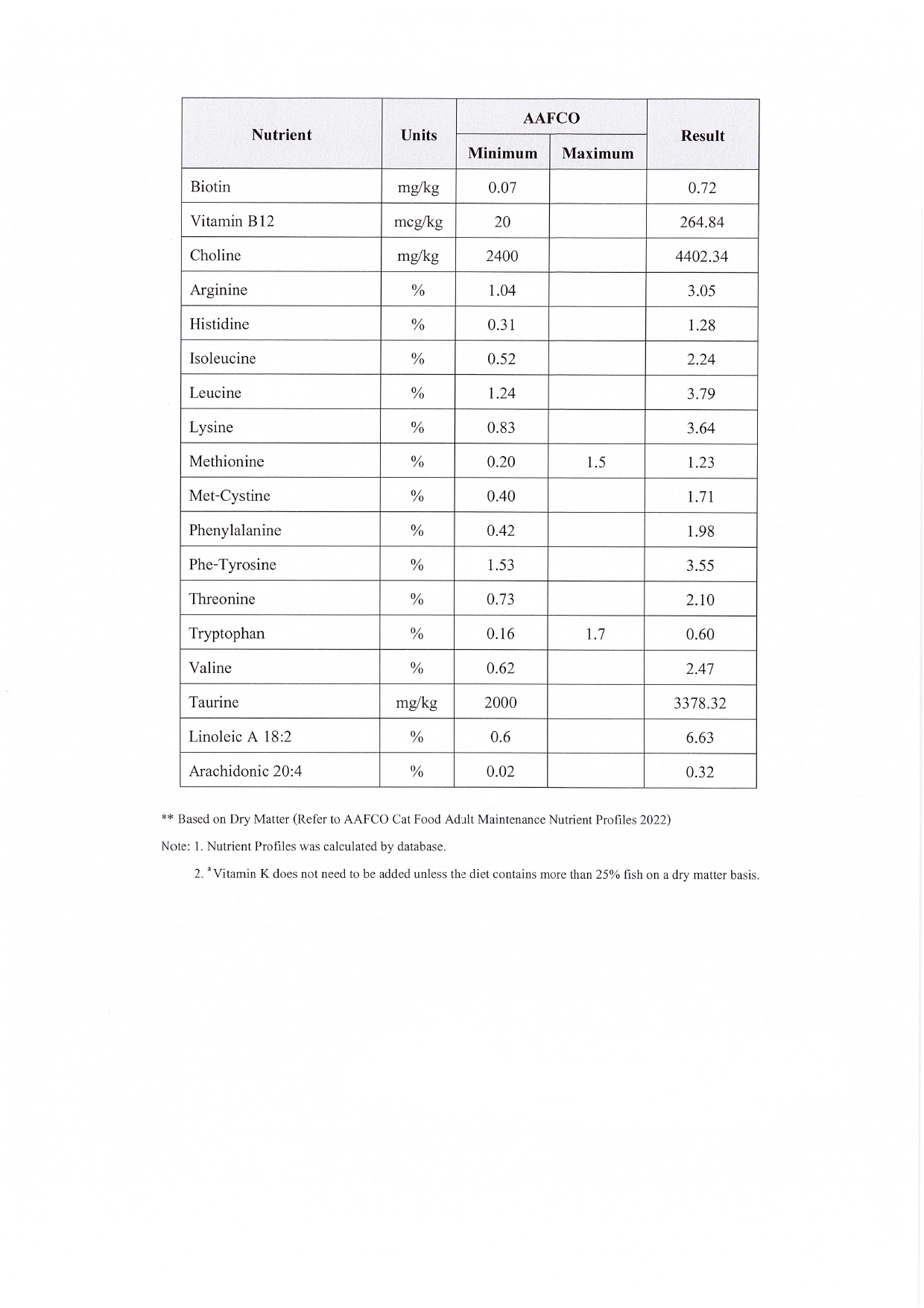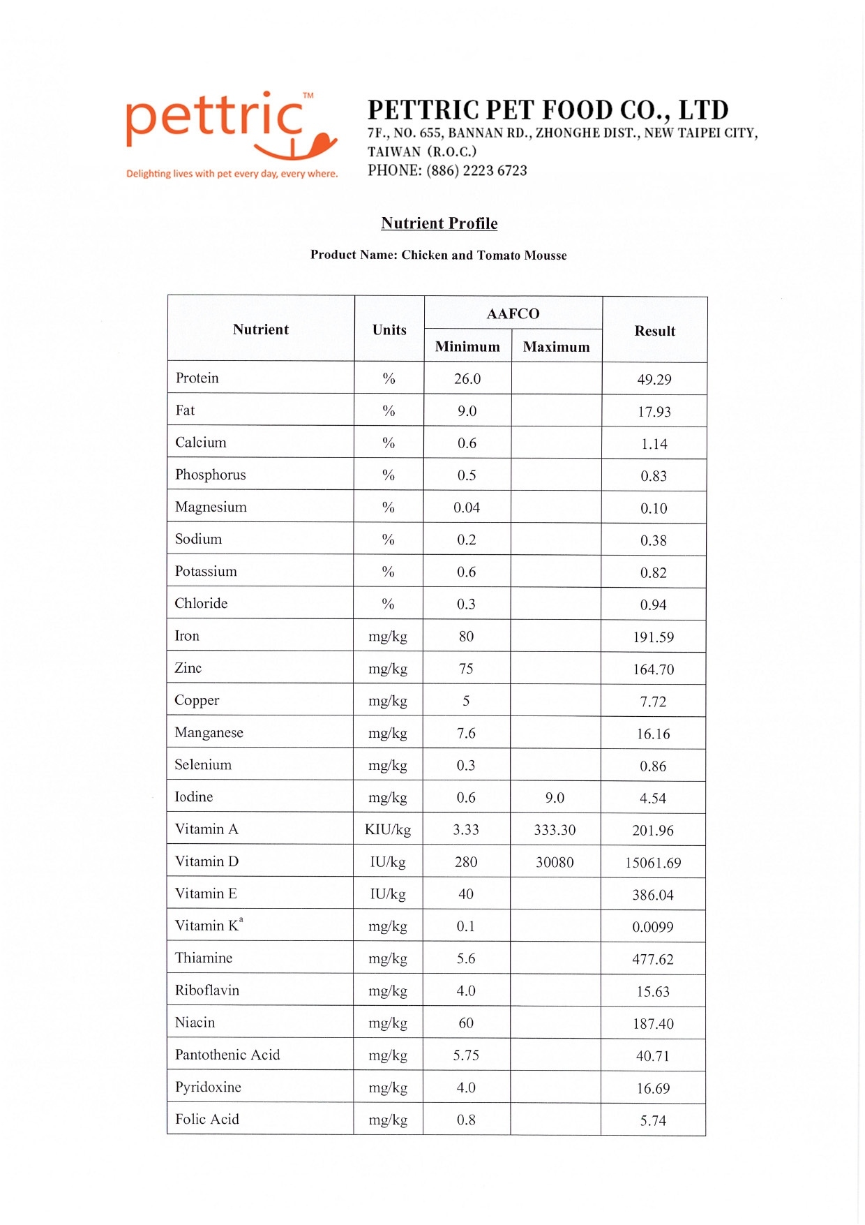 雞肉、雞肝、增稠劑、番茄、葵花籽油、天然香料、礦物質、鮪魚油、氯化膽鹼、低聚果糖、鹽、牛磺酸、維生素、水