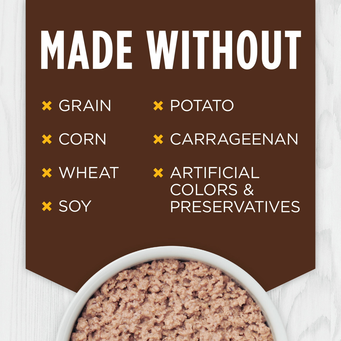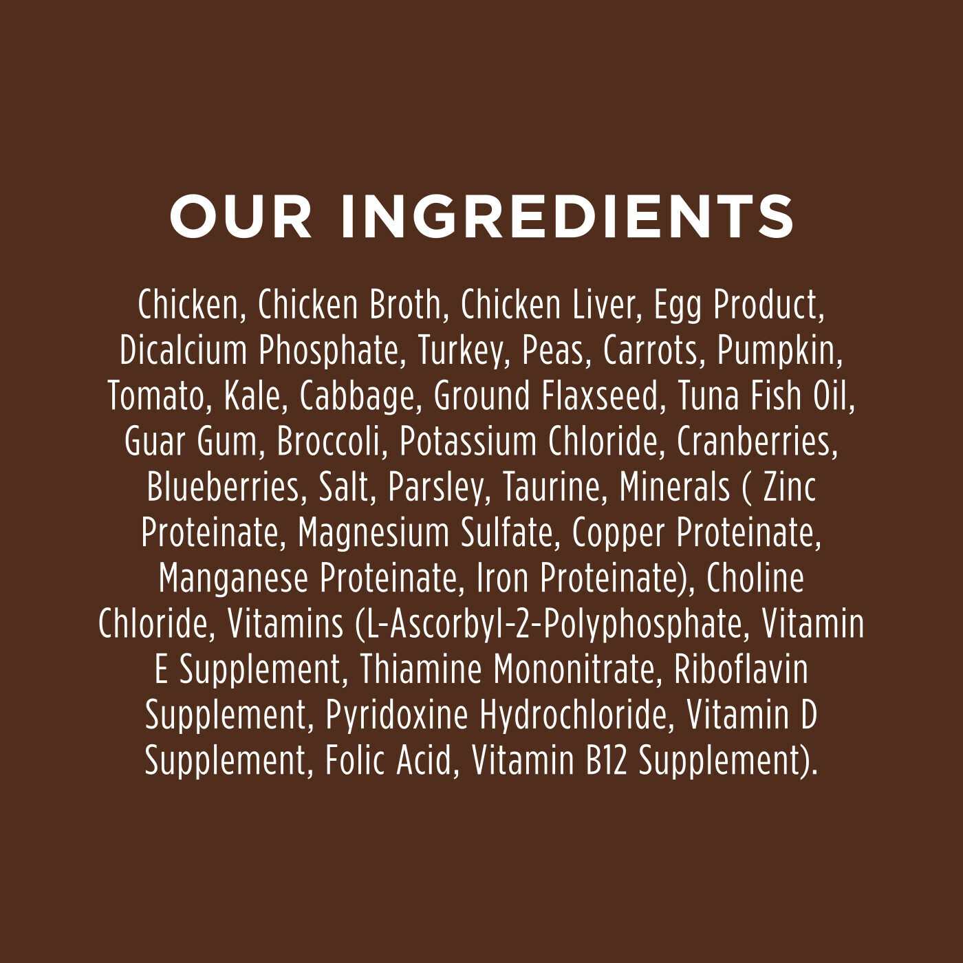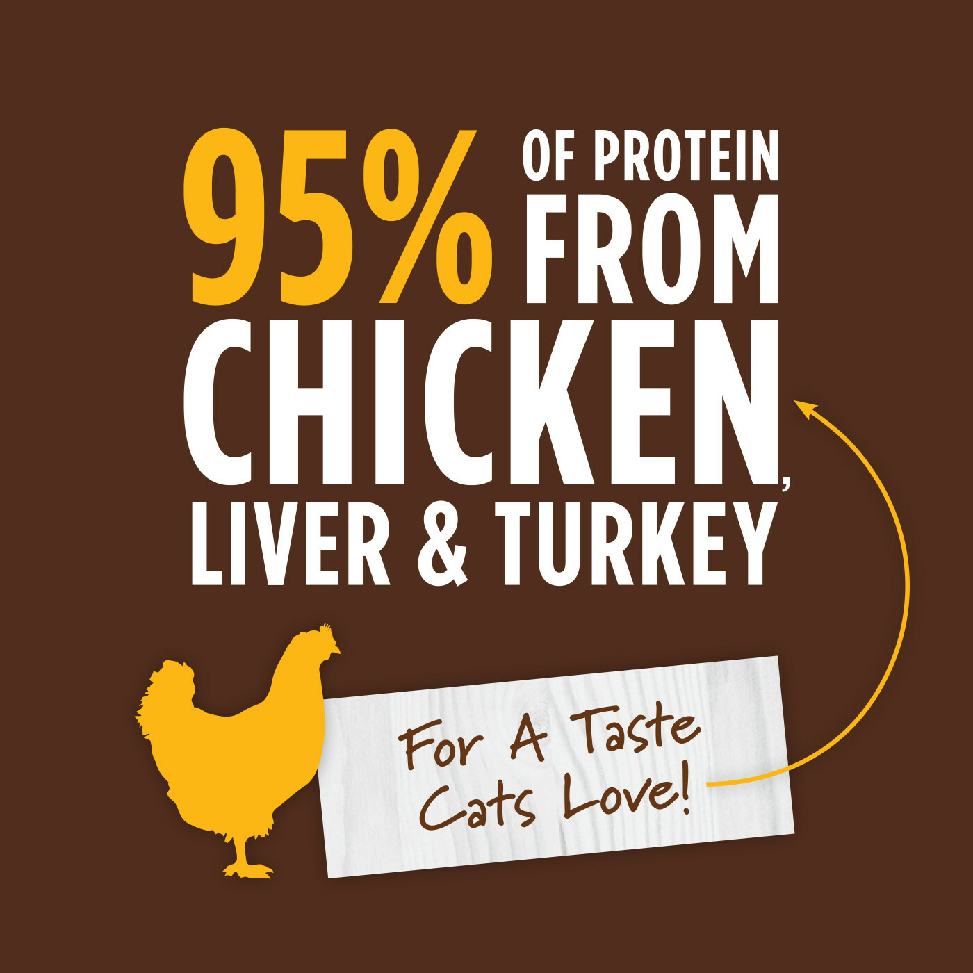 95%的蛋白質來自雞肉,火雞和雞肝 不含穀物,馬鈴薯,玉米,小麥,大豆,人造色素或防腐劑