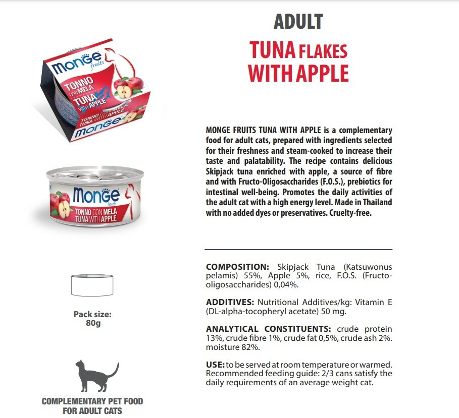 Monge – [清新水果系列] 吞拿魚配蘋果(成貓) Tuna Flakes with Apple (Adult) 80g