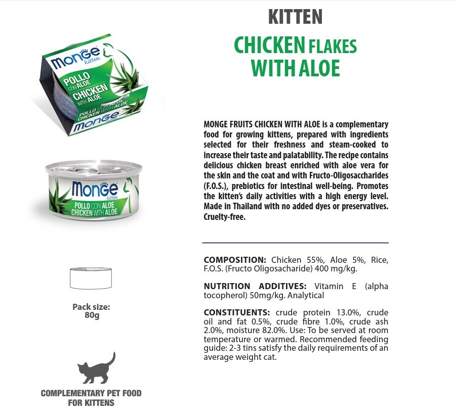 雞肉55%、蘆薈5%、米飯、益生元400 mg/kg。