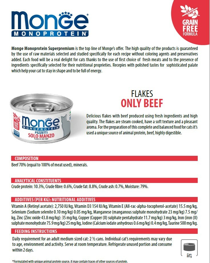 [斷貨中] Monge – [頂級單一蛋白無穀系列] 牛肉主食罐 Flakes only Beef 80g (金紅)