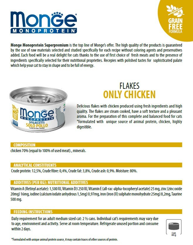 Monge – [頂級單一蛋白無穀系列] 雞肉主食罐 Flakes only Chicken 80g (銀黃)