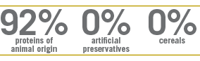 粗蛋白質 33%、粗脂肪 21.5%、粗纖維 1.9%、水分 8%、粗灰分 7.9%、鈣 1%、磷 0.8%、鎂 0.08%、Omega-6 3.3%、Omega-3 0.6%、DHA 0.3%、EPA 0.15%、葡萄糖胺 1200mg/kg、硫酸軟骨素 900mg/kg