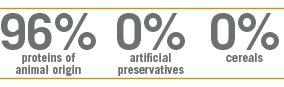 粗蛋白質 40%、粗脂肪 9%、粗纖維 10%、水分 8%、粗灰分 7.9%、鈣 1%、磷 0.8%、鈉 0.3%、鉀 0.7%、鎂 0.08%、Omega-6 2%、Omega-3 0.45%、DHA 0.3%、EPA 0.1%、葡萄糖胺 1200mg/kg、硫酸軟骨素 900mg/kg