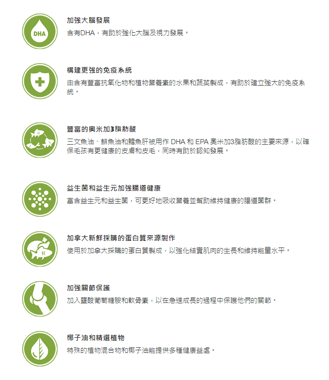 去骨雞肉、雞茸、燕麥、洋薏米、豌豆、紅扁豆、雞肉脂肪(以維他命E作天然防腐)、天然雞肉口味、乾紫花苜蓿、凍乾雞肝、三文魚油、椰子油、碳酸鈣、南瓜、冬南瓜、胡蘿蔔、菠菜、西蘭花、蘋果、藍莓、紅莓、石榴、杜松子萃取、薑、茴香、洋甘菊、薄荷葉、甘草、薑黃、維他命(維他命E、維他命A、菸鹼酸(維他命B3)、泛酸鈣(維他命B5)、核黃素(維他命B2)、鹽酸多醇(維他命B6)、硫胺素(維他命B1)、維他命H、維他命B12、維他命D3、葉酸)、礦物質(硫酸鋅、鋅蛋白、鐵蛋白、硫酸亞鐵、銅蛋白、硫酸銅、錳蛋白、氧化錳、碘酸鈣、亞硒酸鈉)、卵磷脂、鹽、氯化膽鹼、氯化鉀、菊苣根萃取、酵母萃取、碳酸鈣、DL-蛋氨酸、L-賴氨酸、牛磺酸、迷迭香萃取、益生菌。