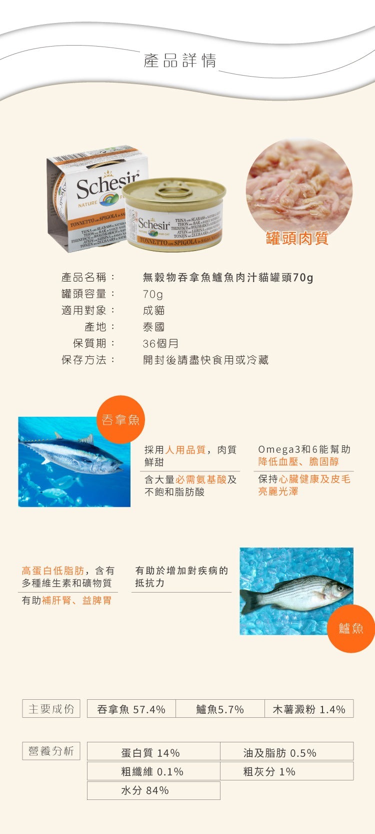 吞拿魚 57.4%、鱸魚 5.7%、木薯澱粉 1.4%