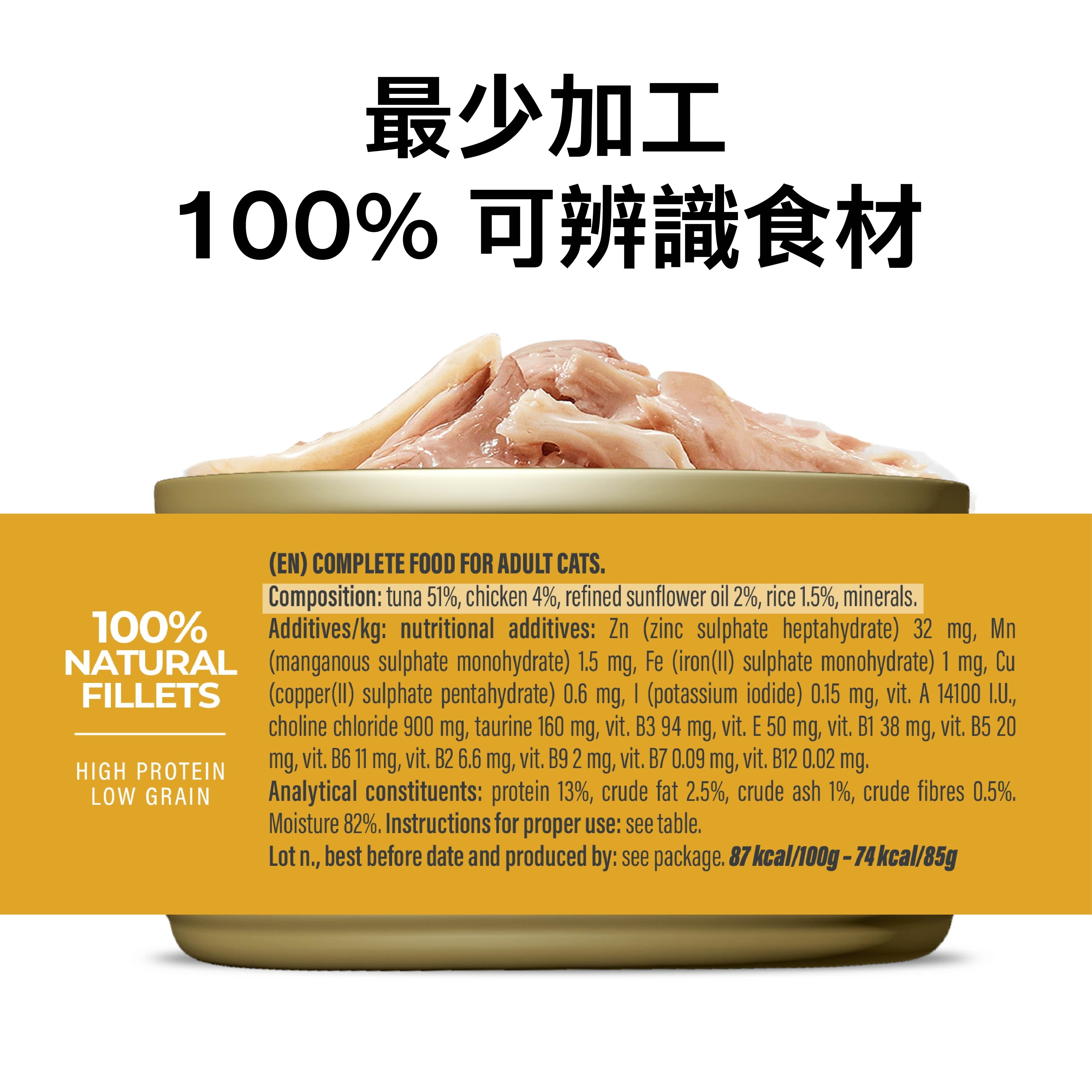 吞拿魚 51%、雞: 4%、白米 1.5%、精煉葵花籽油 2%、礦物質
