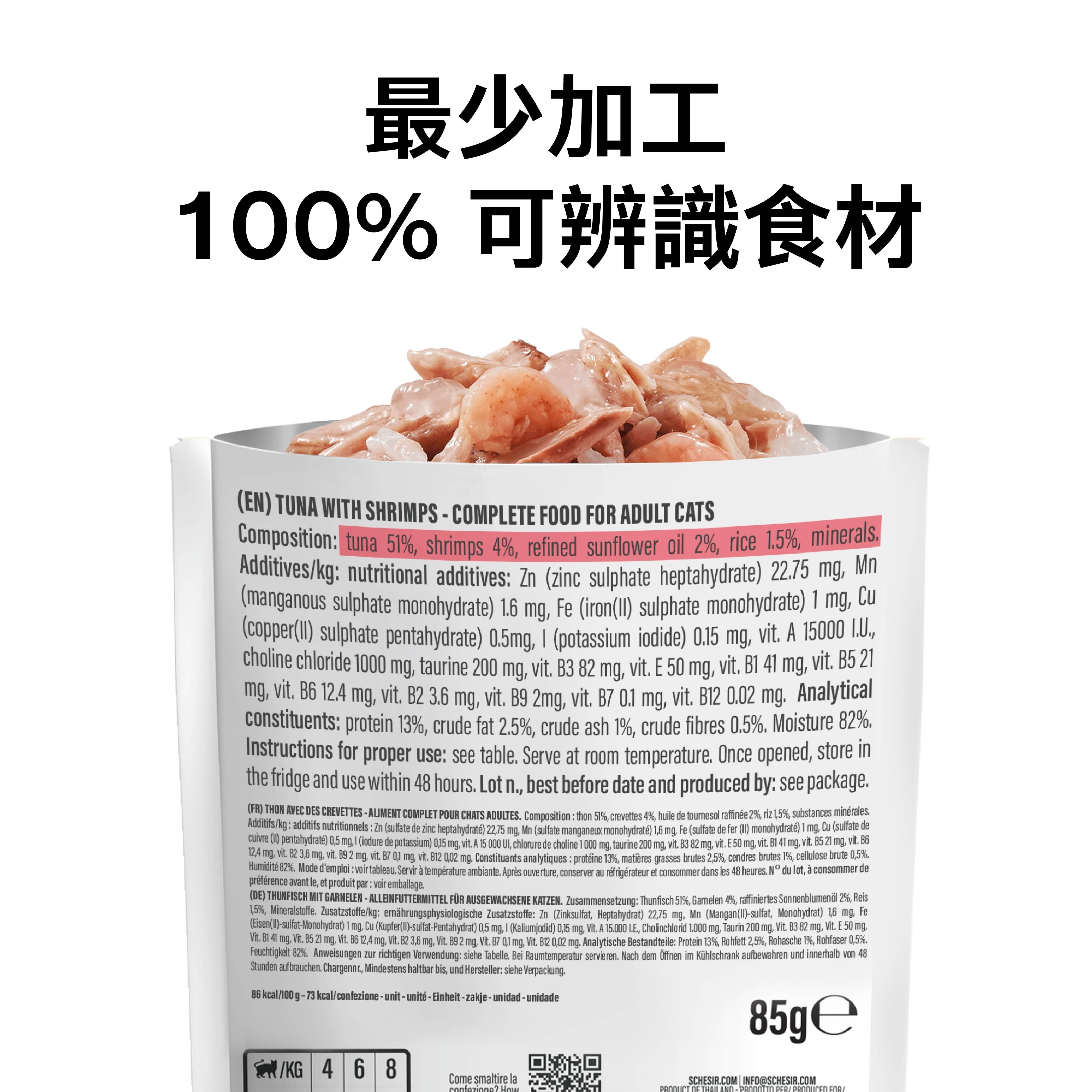 吞拿魚 51%、蝦 4%、白米 1.5%、精煉葵花籽油 2%、礦物質