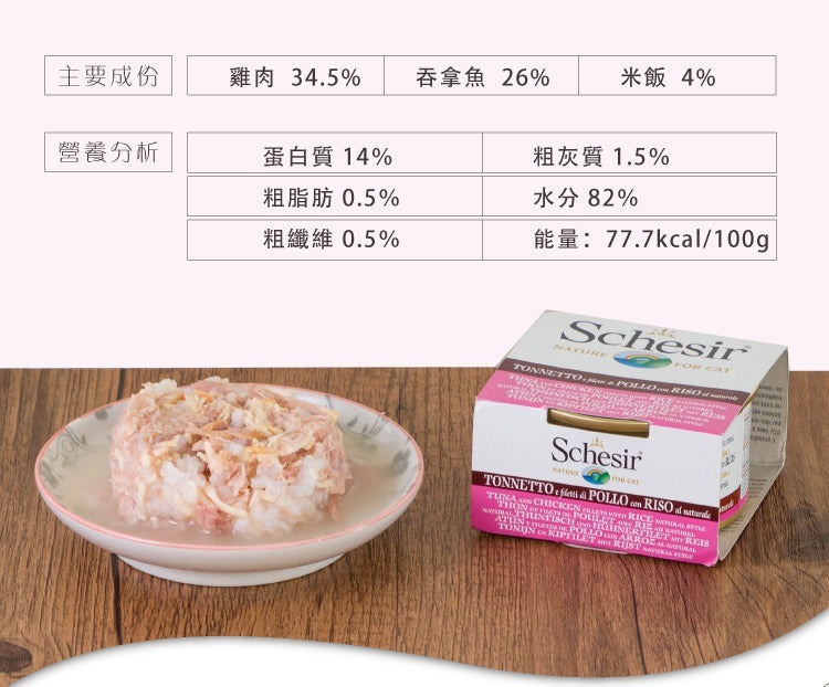 雞肉 34.5%、吞拿魚 26%、米飯 4%