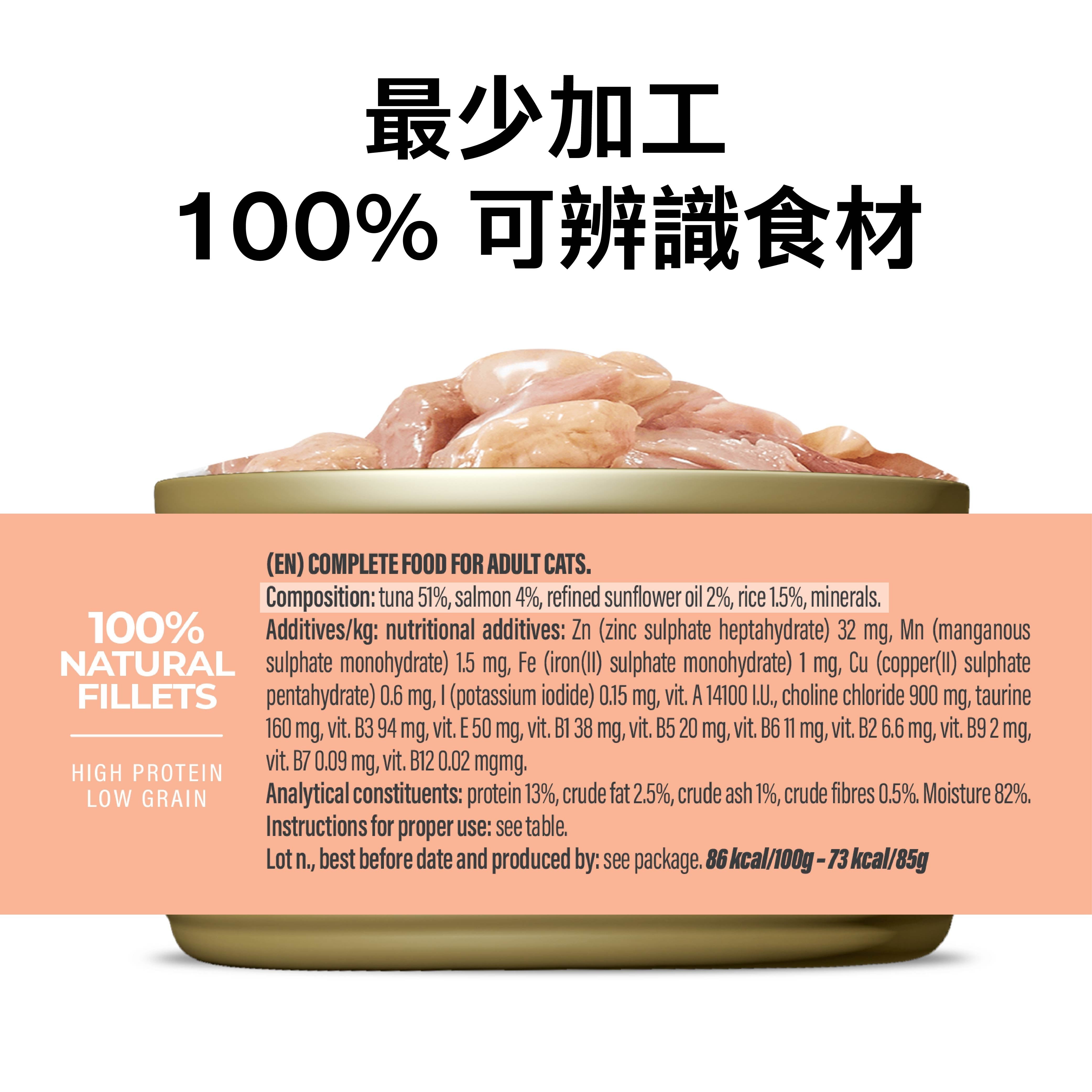 吞拿魚 51%、三文魚 4%白米 1.5%精煉葵花籽油 2%礦物質