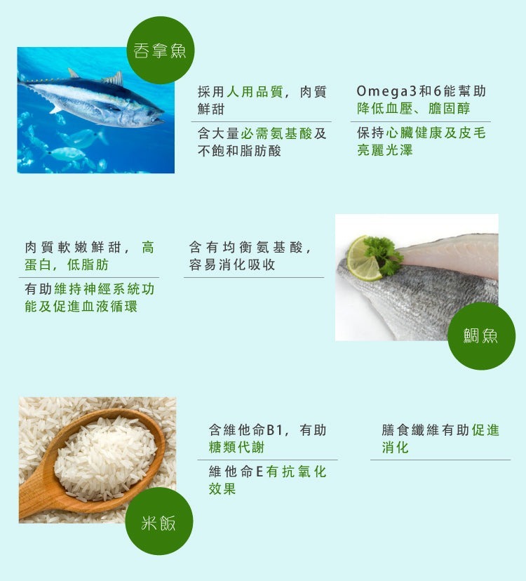 😺肉質鮮甜,人用質量,含有豐富的必需氨基酸和不飽和脂肪酸,如歐米加 3和6,能幫助降低血膽固醇,對心臟健康,皮毛亮麗光澤。