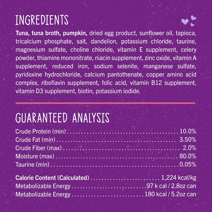 吞拿魚,吞拿魚湯,南瓜,乾蛋製品,葵花籽油,木薯粉,磷酸三鈣,鹽,蒲公英,氯化鉀,牛磺酸,硫酸鎂,氯化膽鹼,維生素E補充劑,芹菜粉,硝酸硫胺素,菸鹼酸補充劑,氧化鋅,維生素A補充劑、還原鐵、亞硒酸鈉、硫酸錳、鹽酸吡哆醇、泛酸鈣、胺基酸銅複合物、核黃素補充劑、葉酸、維生素B12補充劑、維生素D3補充劑、生物素、碘化鉀。