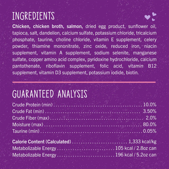 雞肉、雞湯、三文魚、乾蛋製品、葵花籽油、木薯粉、鹽、蒲公英、硫酸鈣、氯化鉀、磷酸三鈣、牛磺酸、氯化膽鹼、維生素E補充劑、芹菜粉、硝酸硫胺、氧化鋅、還原鐵、菸鹼酸補充劑、維生素A補充劑、亞硒酸鈉、硫酸錳、胺基酸銅複合物、鹽酸吡哆醇、泛酸鈣、核黃素補充劑、葉酸、維生素B12補充劑、維生素D3補充劑、碘化鉀、生物素。