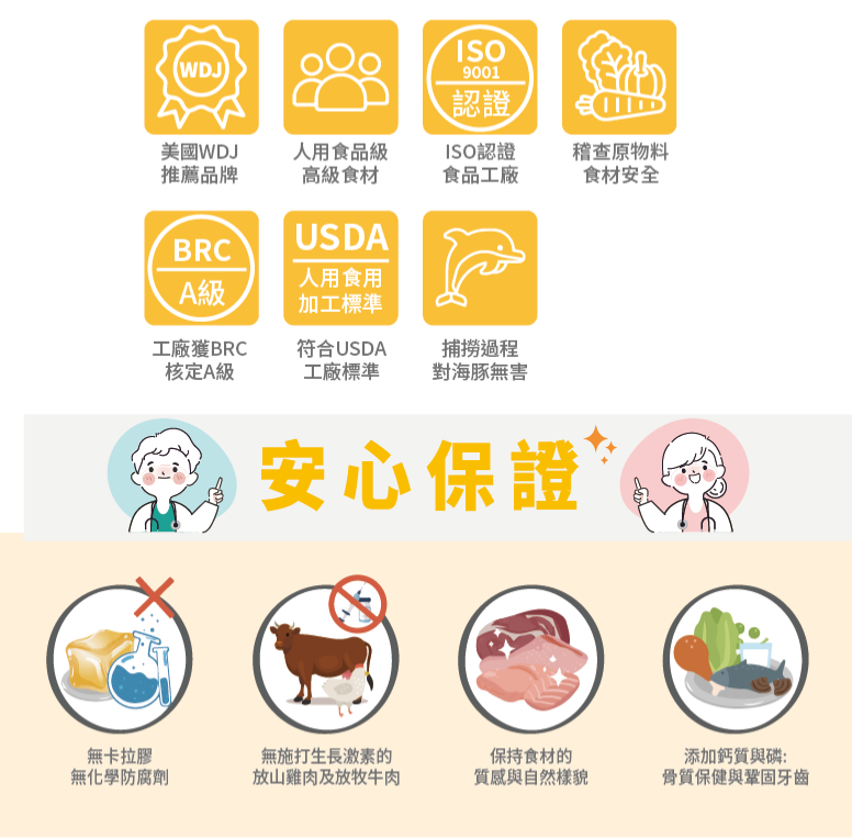 雞湯,雞肉,吞拿魚,天然香料,馬鈴薯澱粉,葵花籽油、乳酸鈣、瓜爾豆膠、雞蛋乾、磷酸三鈣、氯化膽鹼、牛磺酸、硫酸鋅、維生素 E 補充劑、硫胺素單硝酸鹽(維生素 B1)、菸酸補充劑(維生素 B3)、泛酸鈣、維生素 A 補充劑、硫酸錳、核黃素補充劑(維生素 B2)、鹽酸吡哆醇(維生素 B6)、硫酸亞鐵、銅硫酸鹽、維生素 D3 補充劑、葉酸、維生素 B12 補充劑、碘化鉀、甲萘醌亞硫酸氫鈉複合物(維生素 K 的來源)