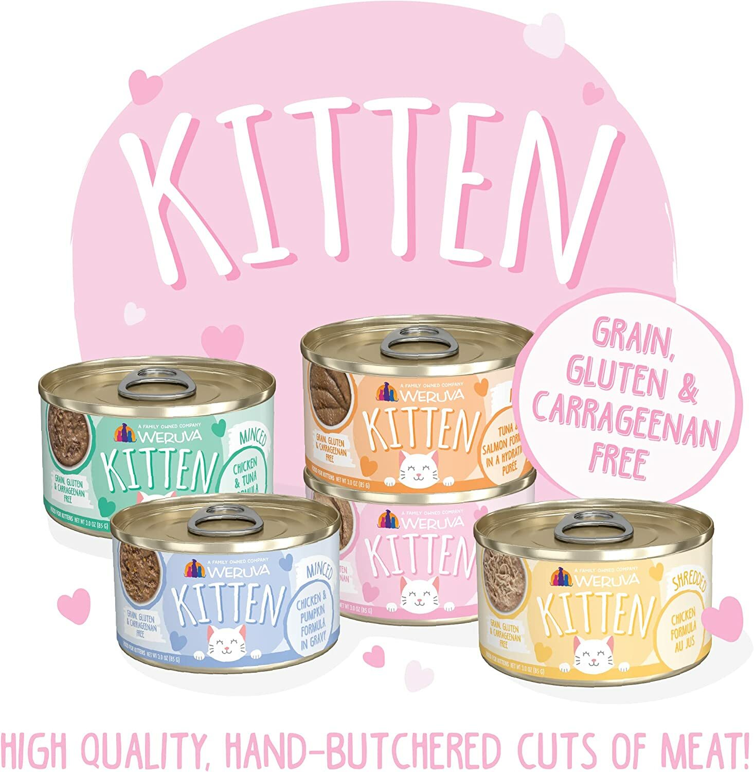 每個Weruva 幼貓食譜都為你的小貓提供了你熟悉和喜愛的優質成分,並且經過專門配製,更好地支持成長中的小貓健康。 始終不含穀物、麩質、角叉菜膠或任何人造香料,可以保證幼貓正在獲得最好的營養!與所有 Weruva 系列產品一樣,我們的幼貓配方含有優質蛋白質(真正的肉!),以及來自美味肉汁或肉醬的高水分含量。