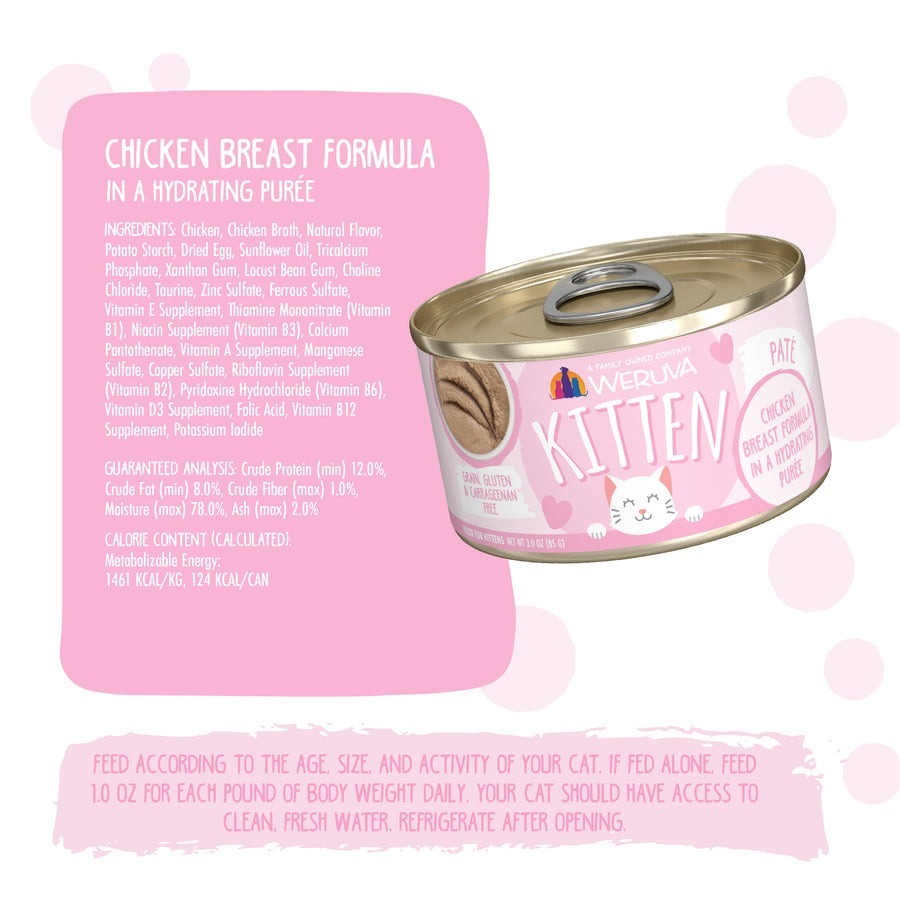 每個Weruva 幼貓食譜都為你的小貓提供了你熟悉和喜愛的優質成分,並且經過專門配製,更好地支持成長中的小貓健康。 始終不含穀物、麩質、角叉菜膠或任何人造香料,可以保證幼貓正在獲得最好的營養!與所有 Weruva 系列產品一樣,我們的幼貓配方含有優質蛋白質(真正的肉!),以及來自美味肉汁或肉醬的高水分含量。