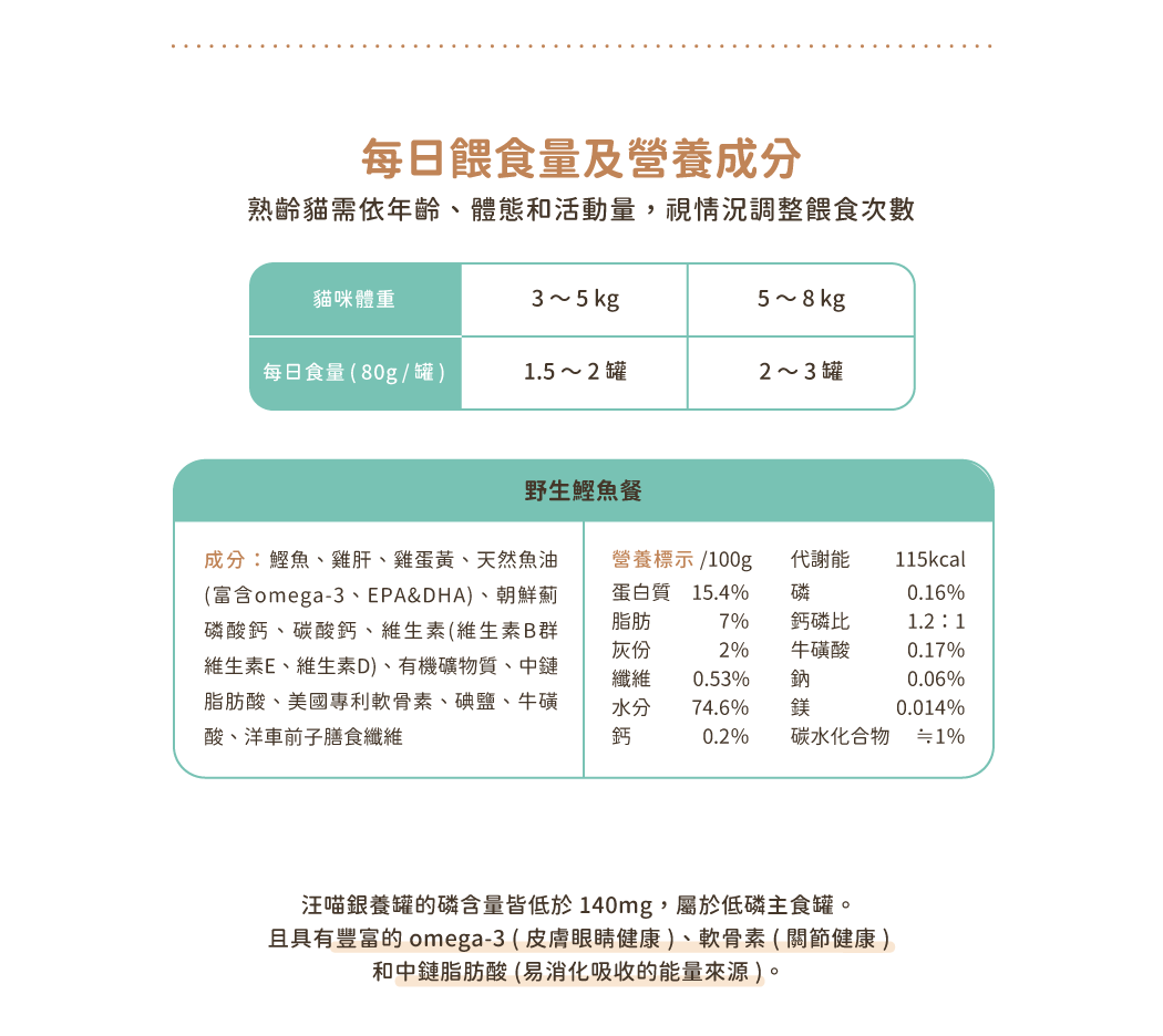 磷含量約 138 mg/100 kcal, 比一般成幼貓款低30%