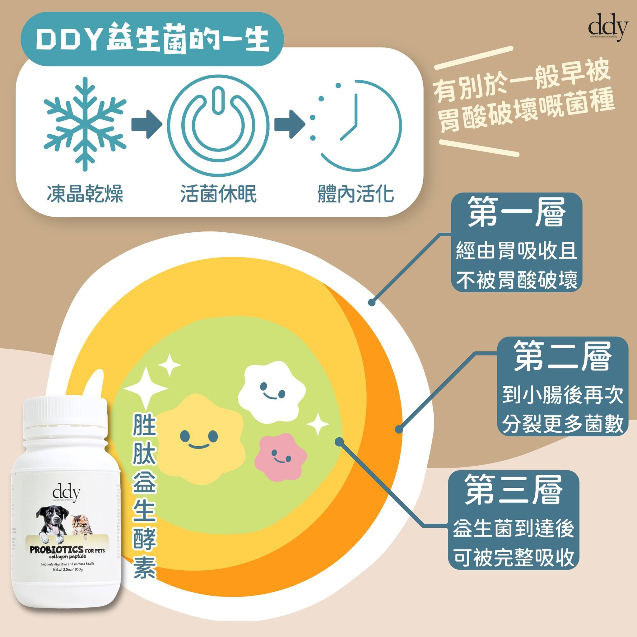 • 益生菌,採用天然原料,是一種高密度複合益生菌,利用尖端生物科技濃縮精製而成,不含人工添加抗生素、藥物、無任何副作用。