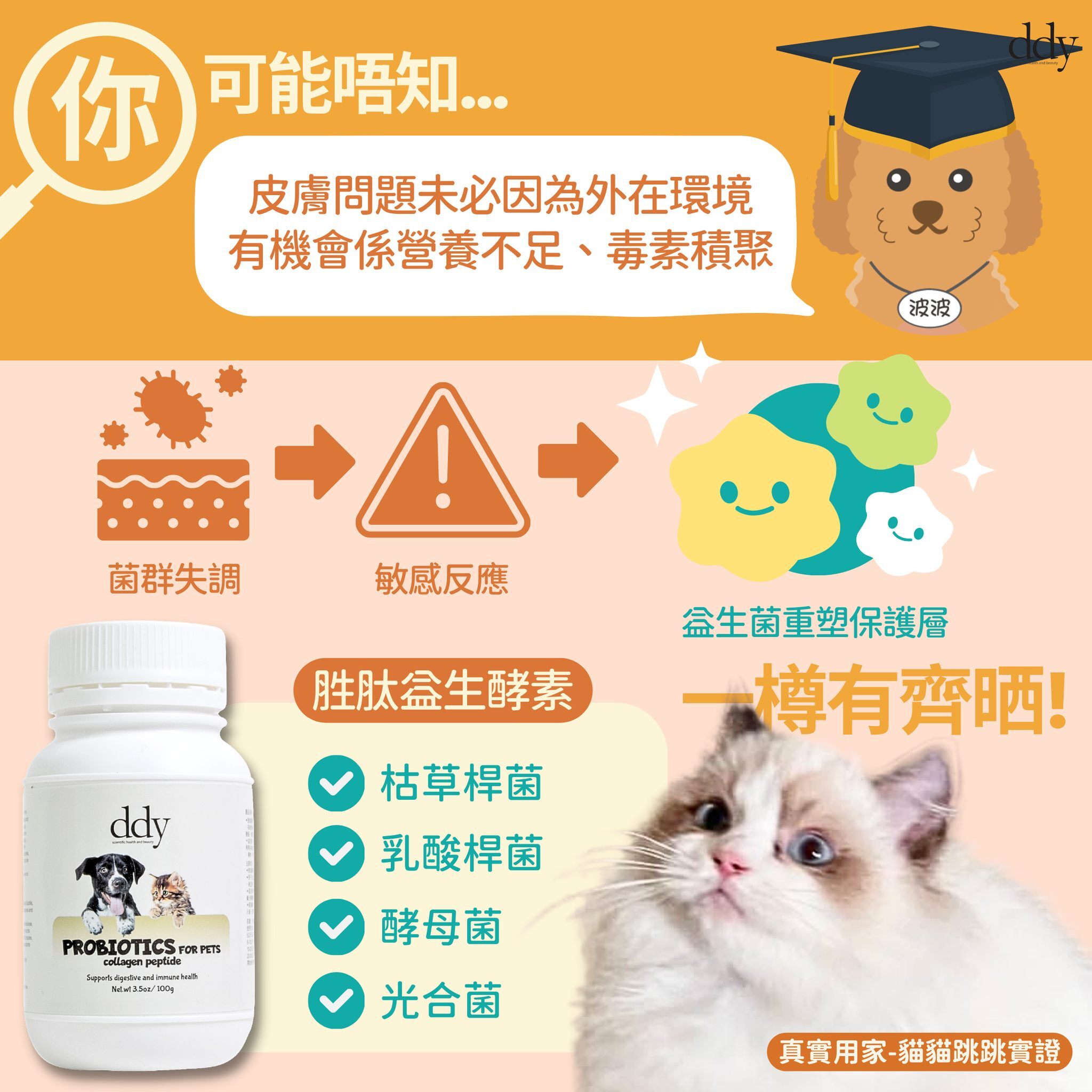 • 維持腸道益生菌叢平衡,寵物活潑有朝氣。