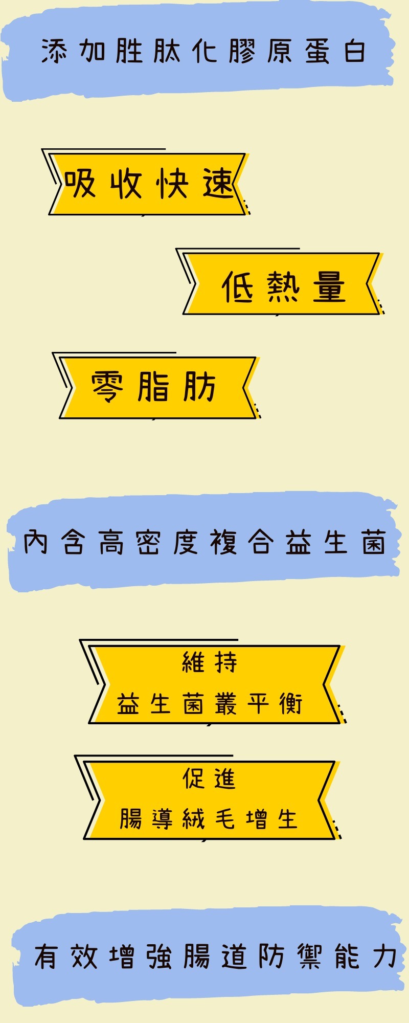 • 胜肽膠原蛋白,由虱目魚鱗萃取,胜肽化的膠原蛋白,吸收快速完整,低熱量、零脂肪、無醣類、無重金屬殘留,無西藥成份添加,沒有副作用疑慮。