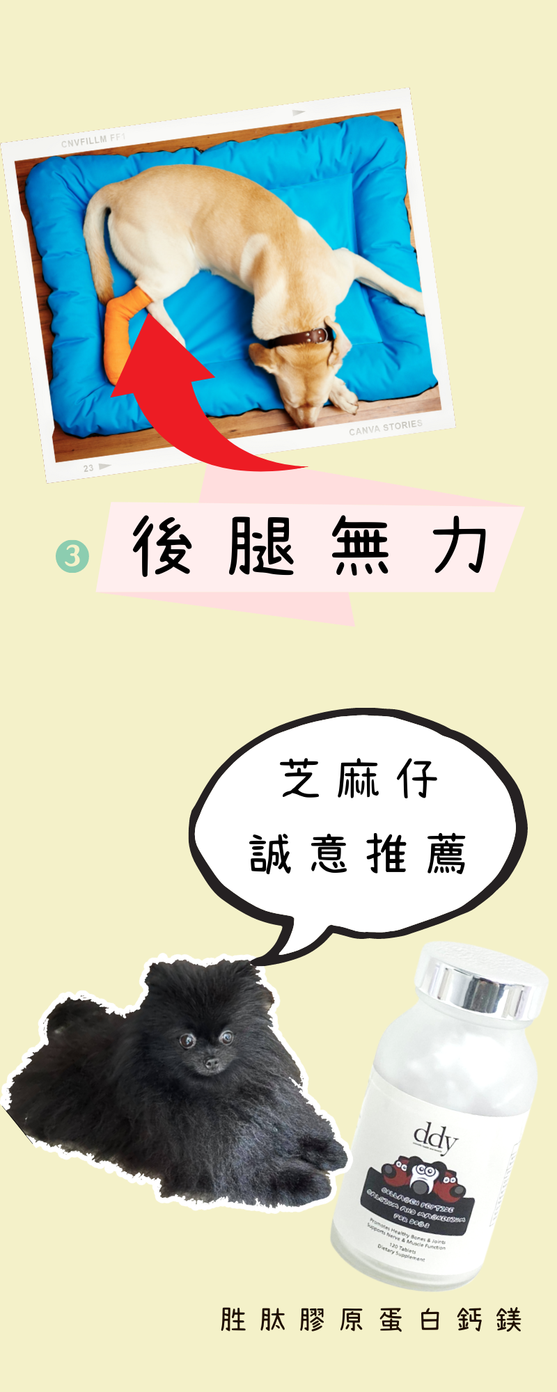 老年犬:當狗狗進入了老年期骨骼疾病的病發率極高,老犬因為內分泌等原因造成鈣的流失,因而導致肌肉萎縮、腿部抽筋、痙攣現象,應及時為老年犬補充鈣質,有效預防骨刺、骨折、骨質疏鬆等疾病。